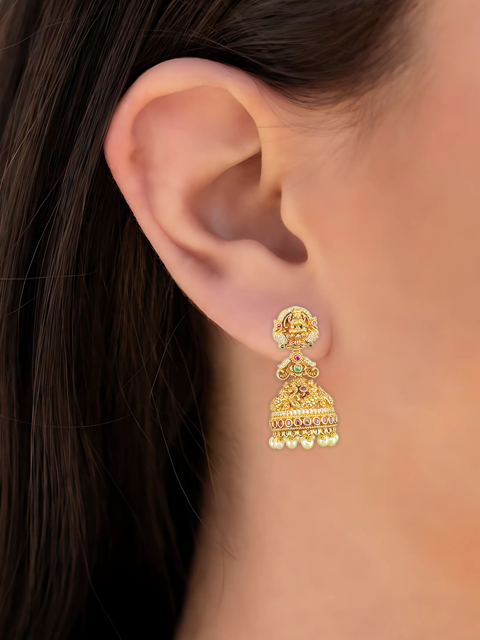 Traditional jhumkas featuring intricate Laxmi motifs, adorned with shimmering white stones and elegant pearl drops. A graceful expression of devotion and style, perfect for festive occasions and cultural celebrations.