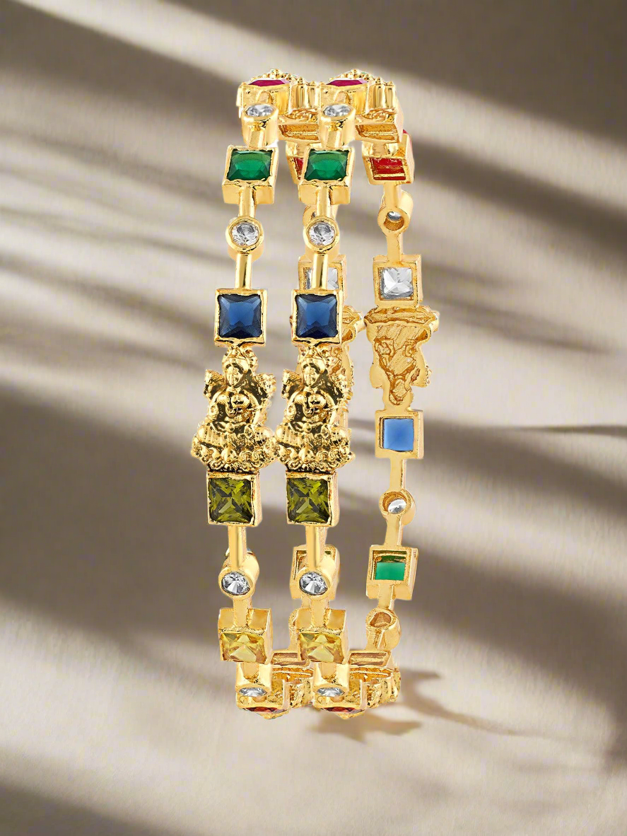 Add a splash of vibrant elegance with this elegant navratan cz bangles, crafted in 92.5 sterling silver and adorned with a brilliant mix of Navratan stones and sparkling cubic zirconias. These bangles offer a perfect blend of timeless beauty and colorful charm.